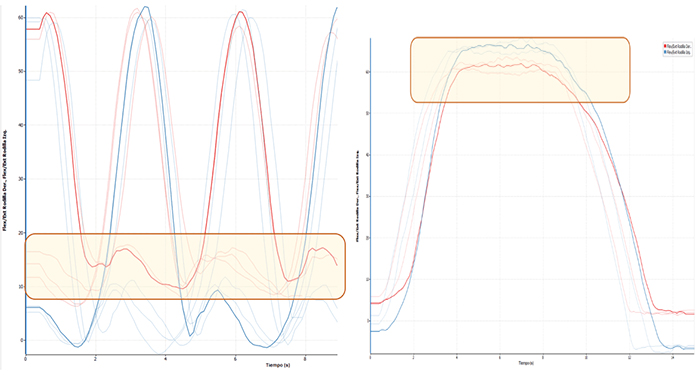 In general, gait functionality was normal at the kinematic level, with the exception of a slight flexion during the contact phase, which was maintained in the initial stance phase prior to swing. Additionally, during the semi-squat movement, a more or less symmetrical behaviour of the flexion angles was observed in the eccentric descent phase, with a difference of less than 5 degrees.