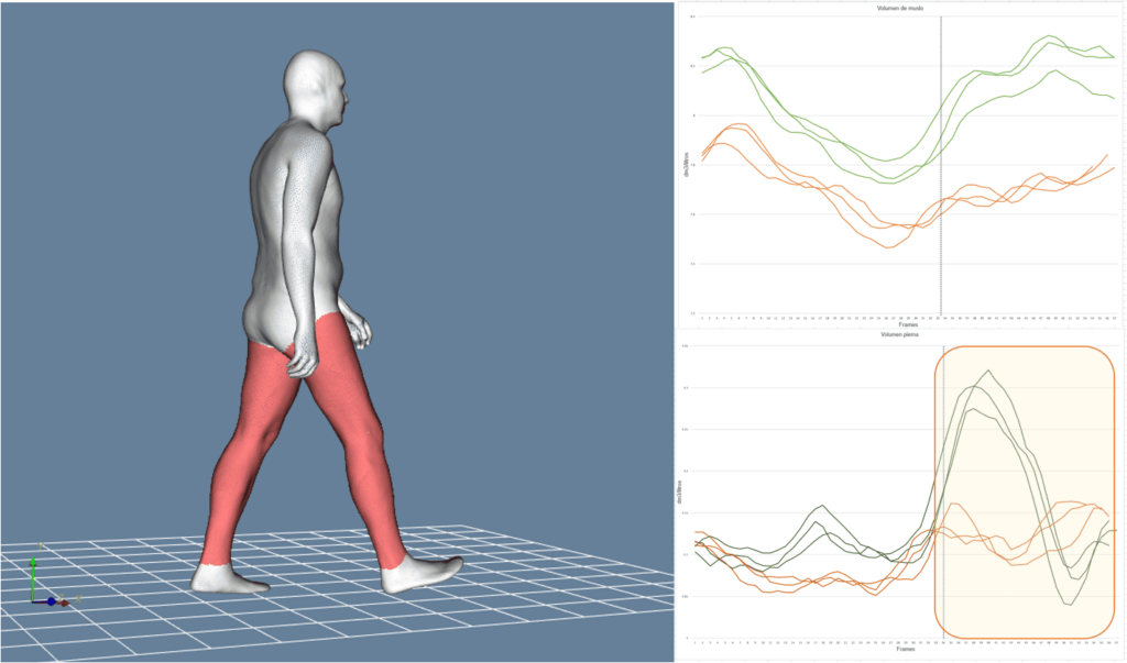 - In the assessment of gait function, differences in morphology and magnitude of both perimeters and volumes are observed in the thigh and leg of the injured limb, which may represent functional deficits such as compensatory strategies.